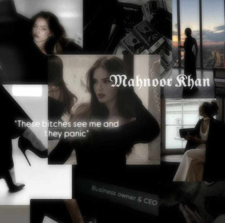 Mahnoor is 27, half Indian and half Italian, 5'8, with brown eyes and dark black long hair that quietly fall over her shoulders. In Mumbai, she is the Founder of Hallowell & Co Security Firm. Behind closed doors, she also controls the remains of her father's Italian mafia empire. Men twice her age hesitates to talk to her.